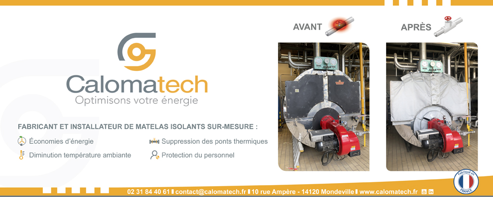Avec l’attention portée aux déperditions de chaleur et toujours à la recherche d’économies d’énergie, la société Calomatech, spécialisée dans la fabrication de matelas d’isolation thermique pour les robinetteries industrielles, montre un avenir prometteur. L’entreprise normande, fondée en 2017 par Gwenaël Breton et basée à Mondeville, près de Caen, connaît une croissance soutenue. Des économies d’énergie peuvent être augmentées de 12 % à 24 % en isolant les réseaux (robinets, vannes, filtres, brides...) des robinetteries industrielles (eau chaude, vapeur, huiles thermiques) avec des matelas thermiques.