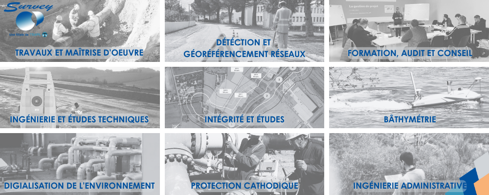 SURVEY est un bureau d’études d’ingénierie et de topographie, spécialisé dans les infrastructures de réseaux, de relevés de bâtiments, et de bathymétrie, qui coordonne et met en synergie un large éventail de compétences qui en font un interlocuteur privilégié de l’industrie, du transport en canalisation, des services des eaux et d’électricité, et des collectivités.